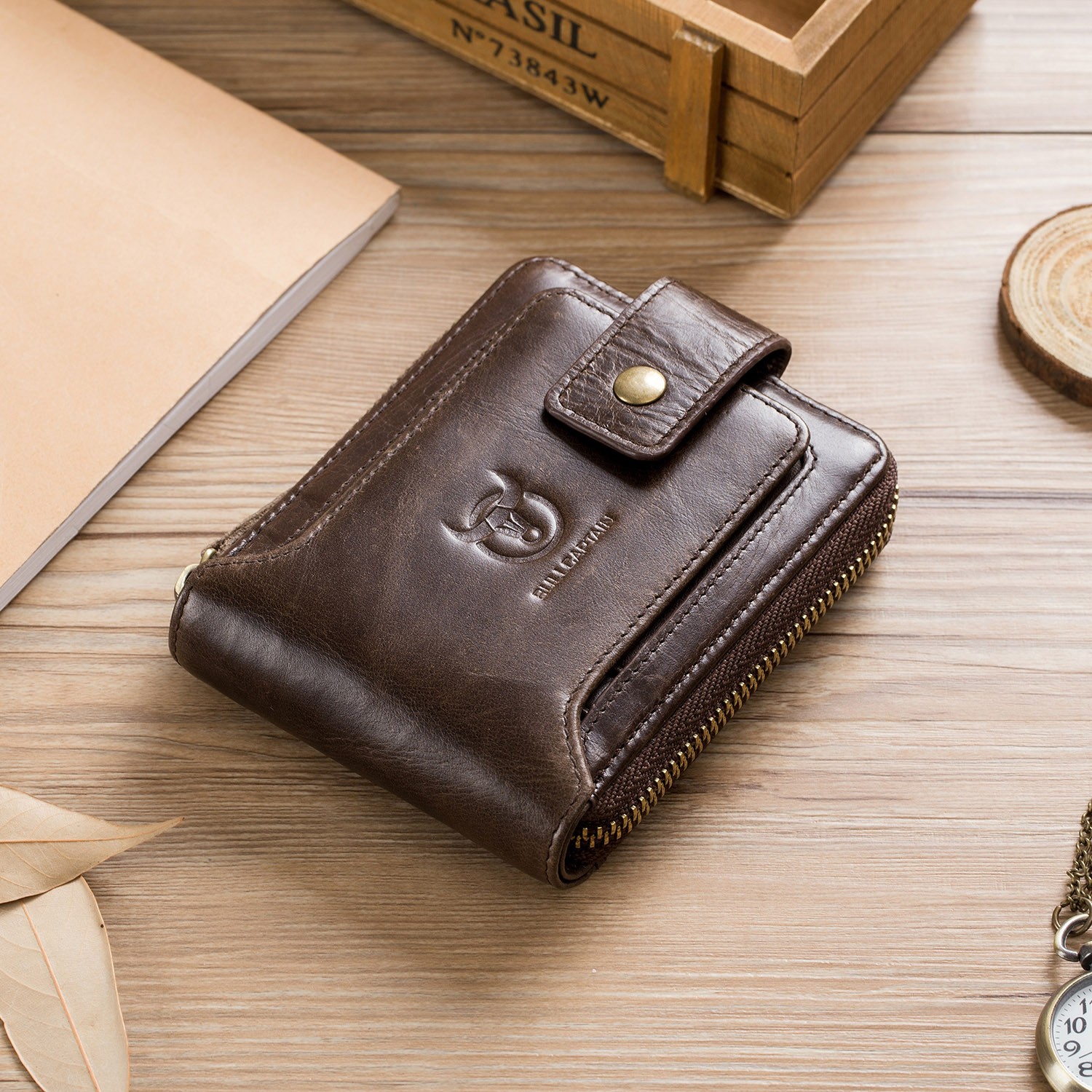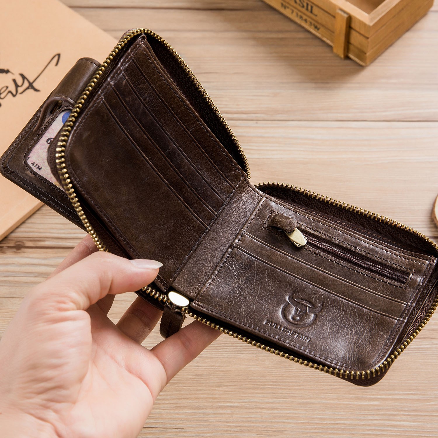 Retro Men Wallet Genuine Leather RFID Blocking Bifold with Zipper Coin Pocket