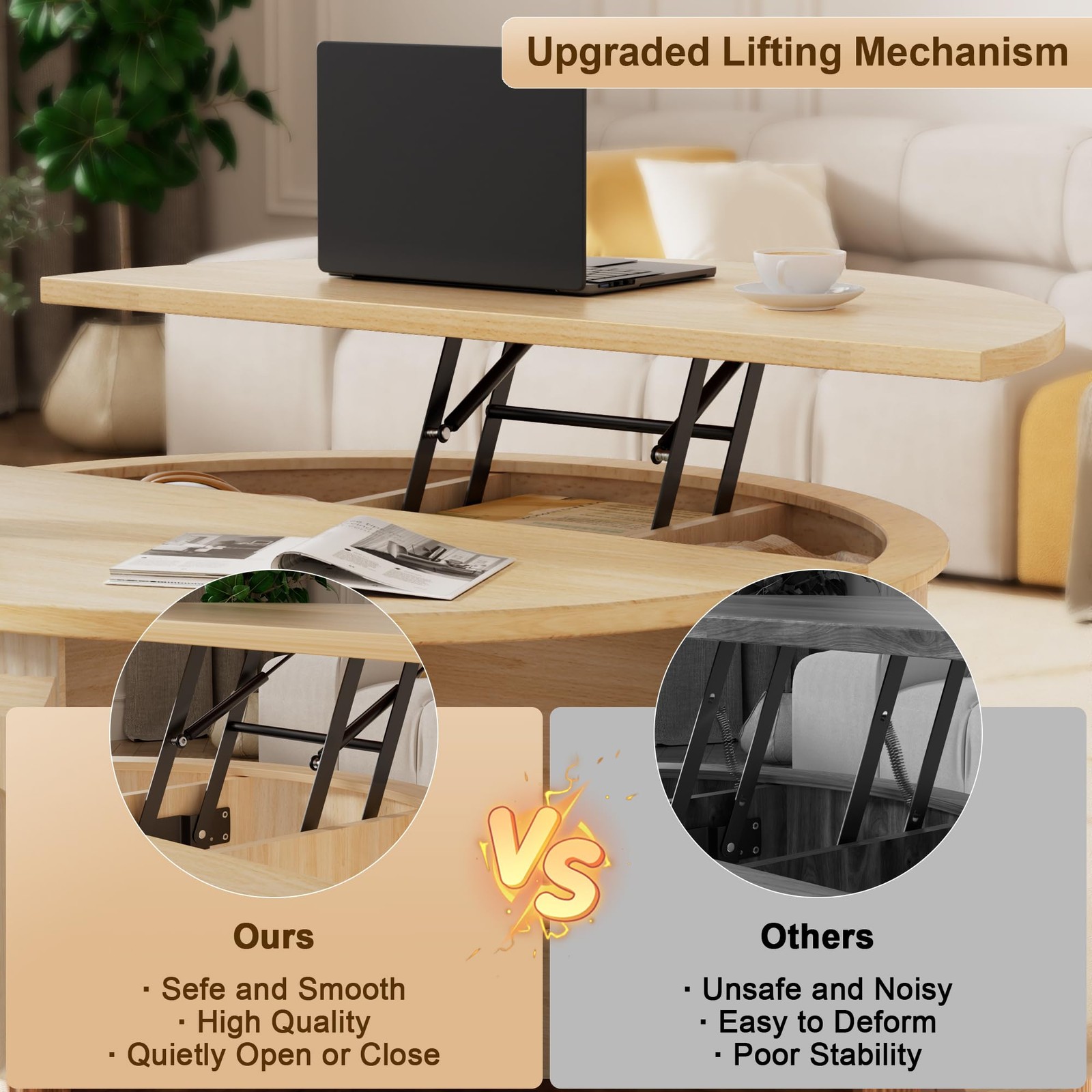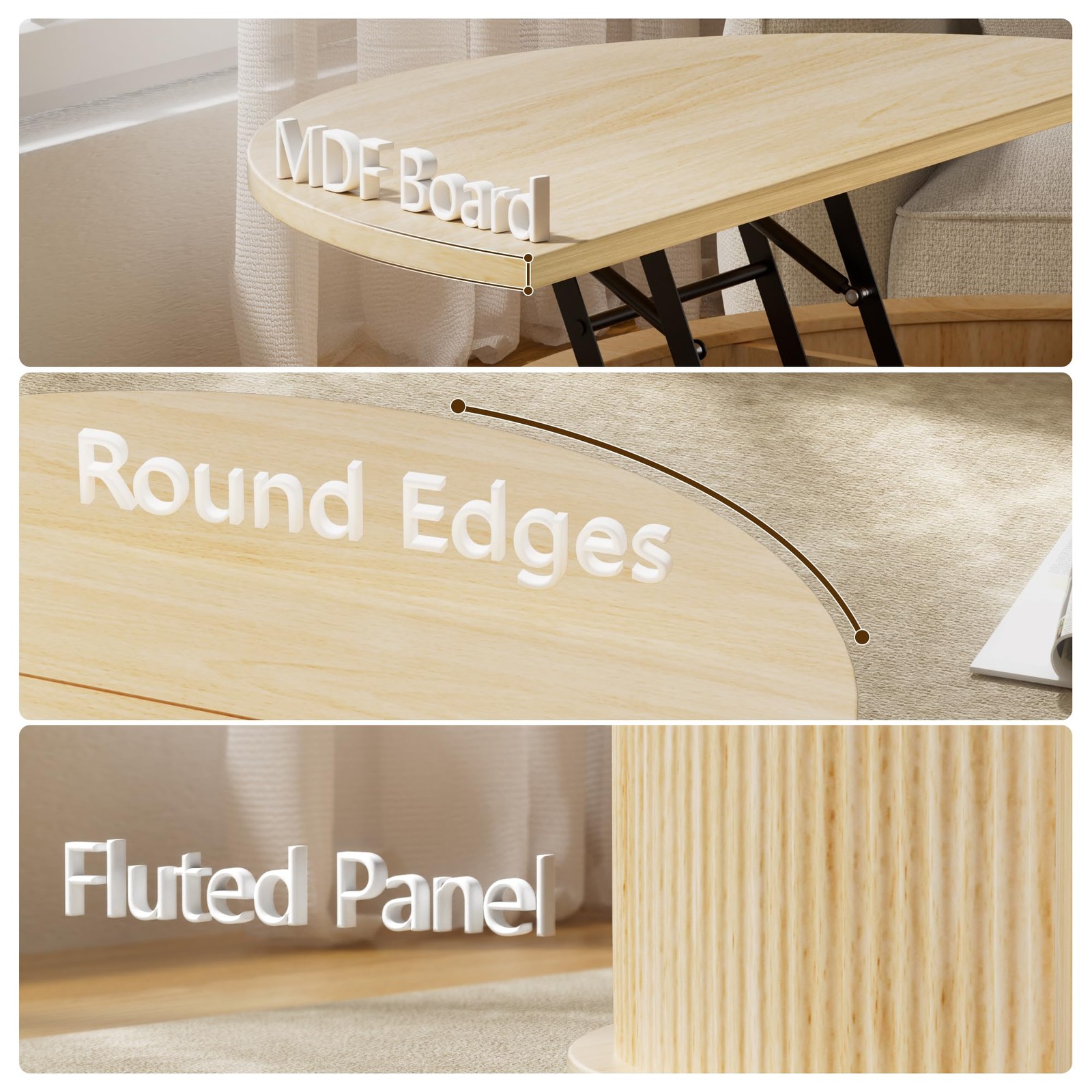 Fluted Lift Top Coffee Table with Storage, Modern Oval Tea Table for Living Room