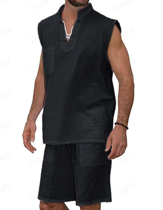 Men's 2 PC Cotton Linen Set Long Sleeve Henley Shirts & Beach Pants Black 2XL