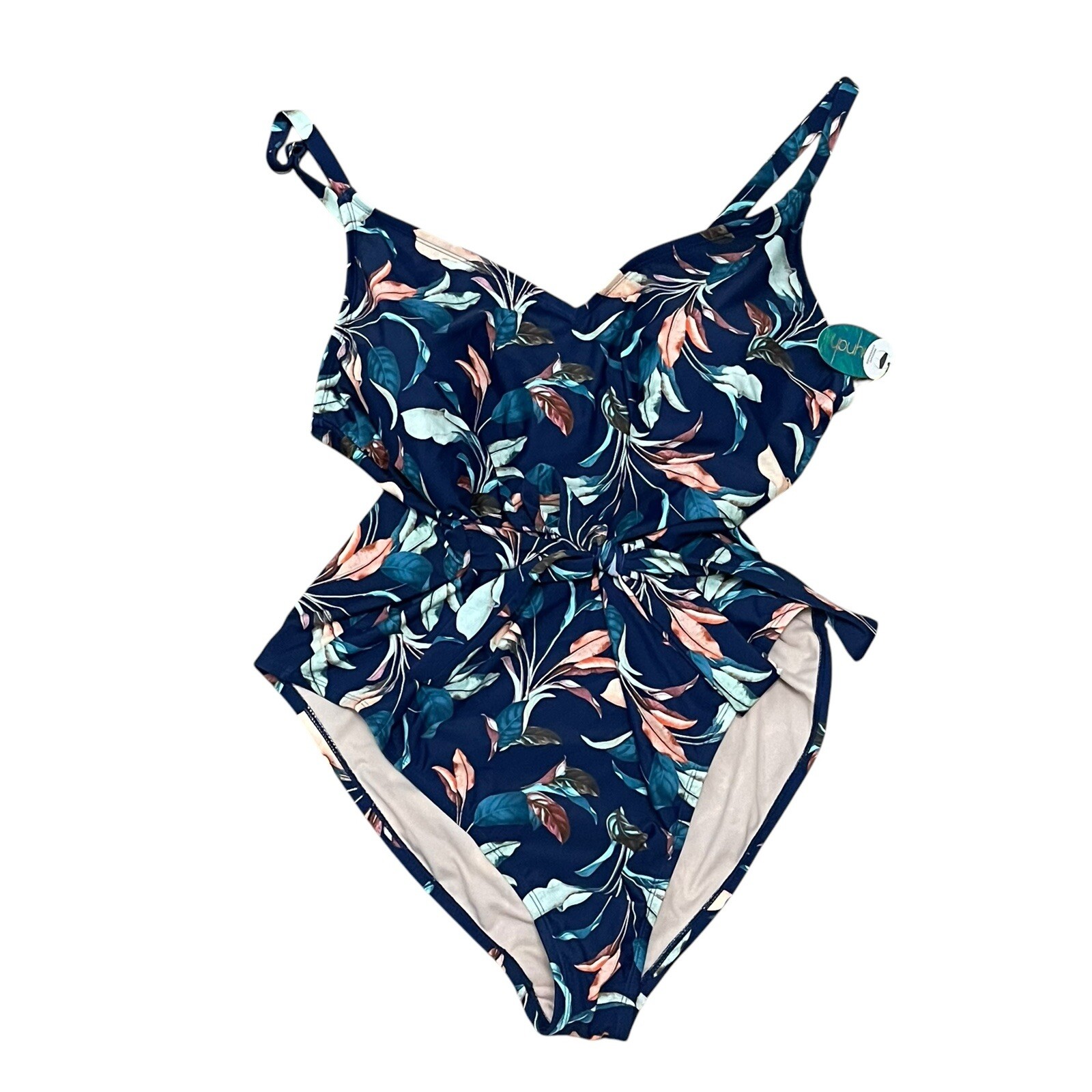 NWT MYNAH High Leg Belted One Piece Women Swim Bathing Suit Sz M Abstract Palm