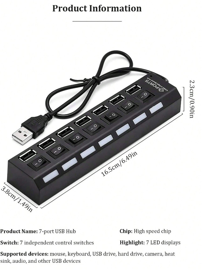 7 Port USB 2.0 For PC Laptop Mac Desktop With 5V 2a Power Supply For Outlets