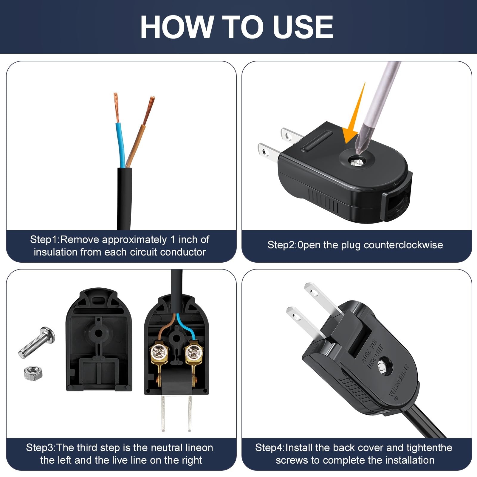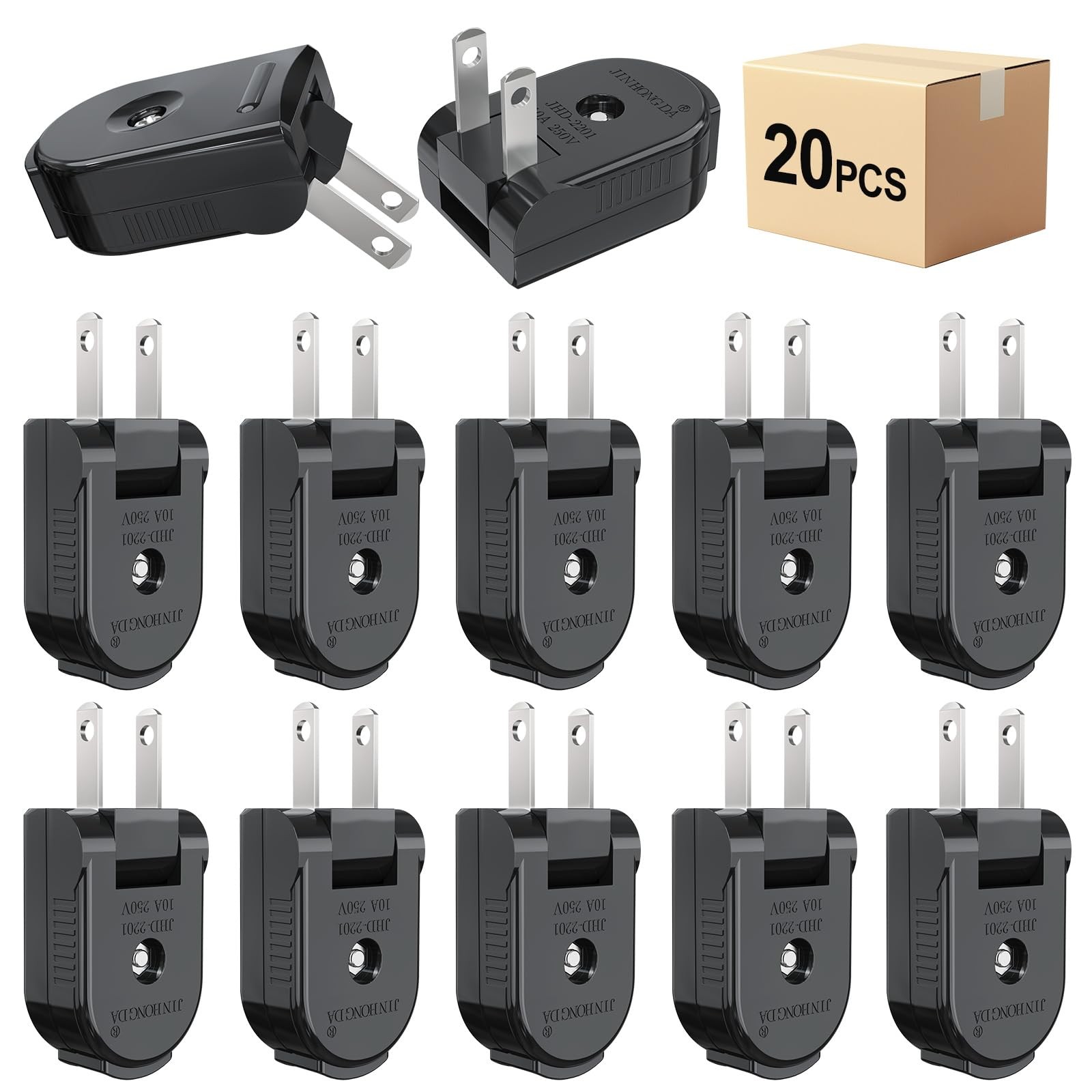 Extension Cord Replacement Male Power Plug, 2 Prong, 125V/10A, 20-Pack, Black