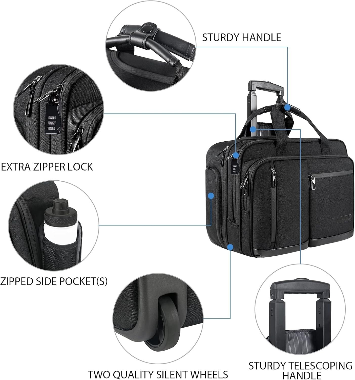 17.3" Waterproof Rolling Laptop Briefcase with RFID and Lockable Zipper