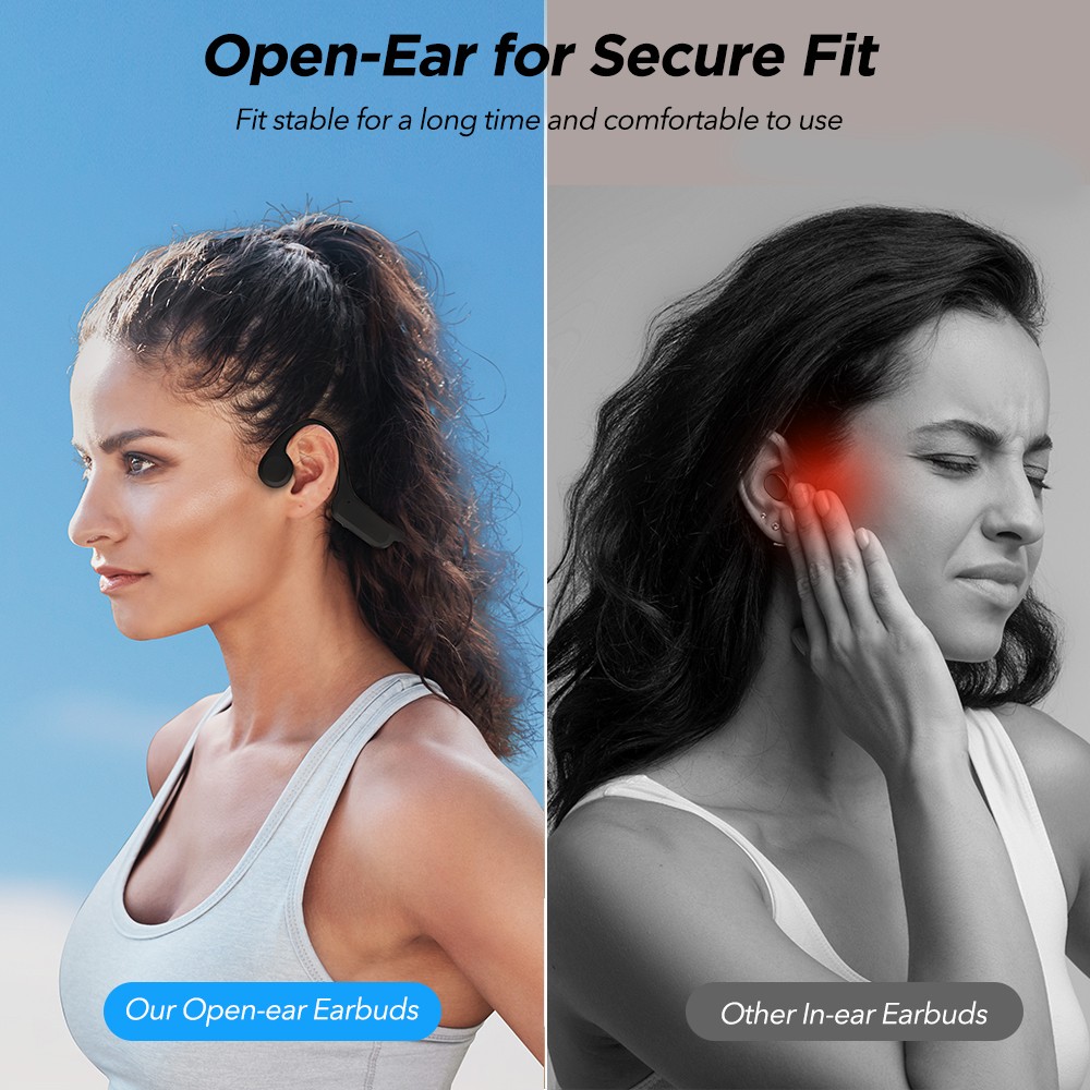 Features: 1.Open-Ear Design: With an open ear design, bone conduction headphones use vibration to transmit sound through the cheekbone to the interior for balanced and clear audio and optimal volume, allowing you to enjoy music while still sensing the sound around you. 2.Waterproof Sports Headphones: Open ear headphones with IPX6 waterproof rating standard certification, which can prevent sweat, dust, and moisture. With waterproof and sweatproof Bluetooth headphones even if you sweat during your exercise, and sports Earphones it is durable enough for you to experience a hassle-free workout. .