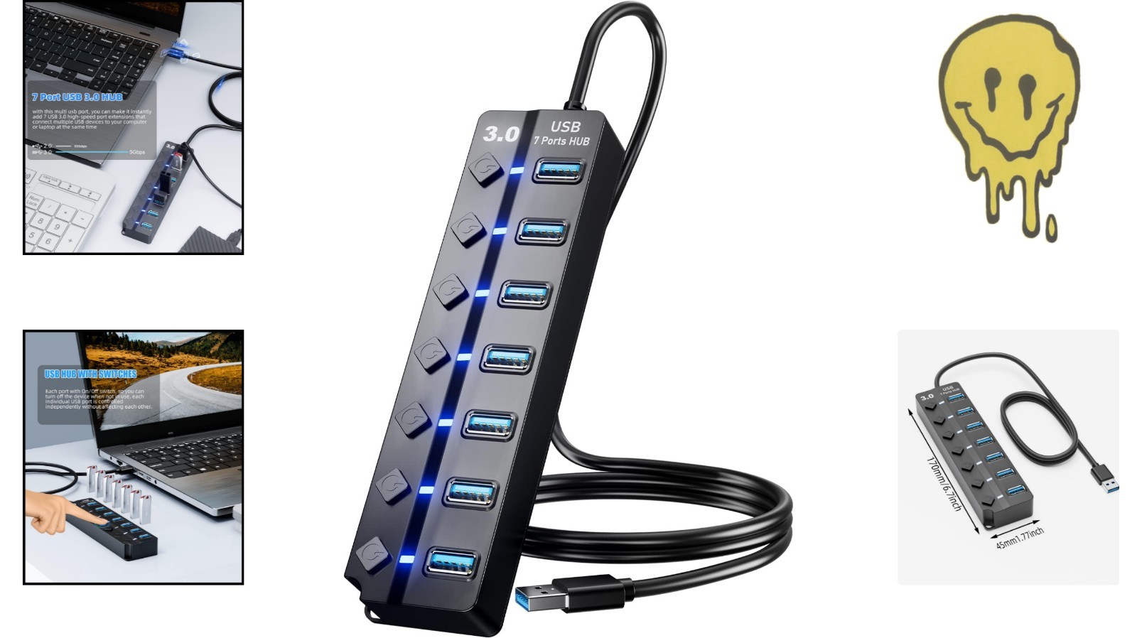 USB 3.0 Hub 7 Port On/Off Switch High Speed Splitter AC Adapter Cable PC Laptop