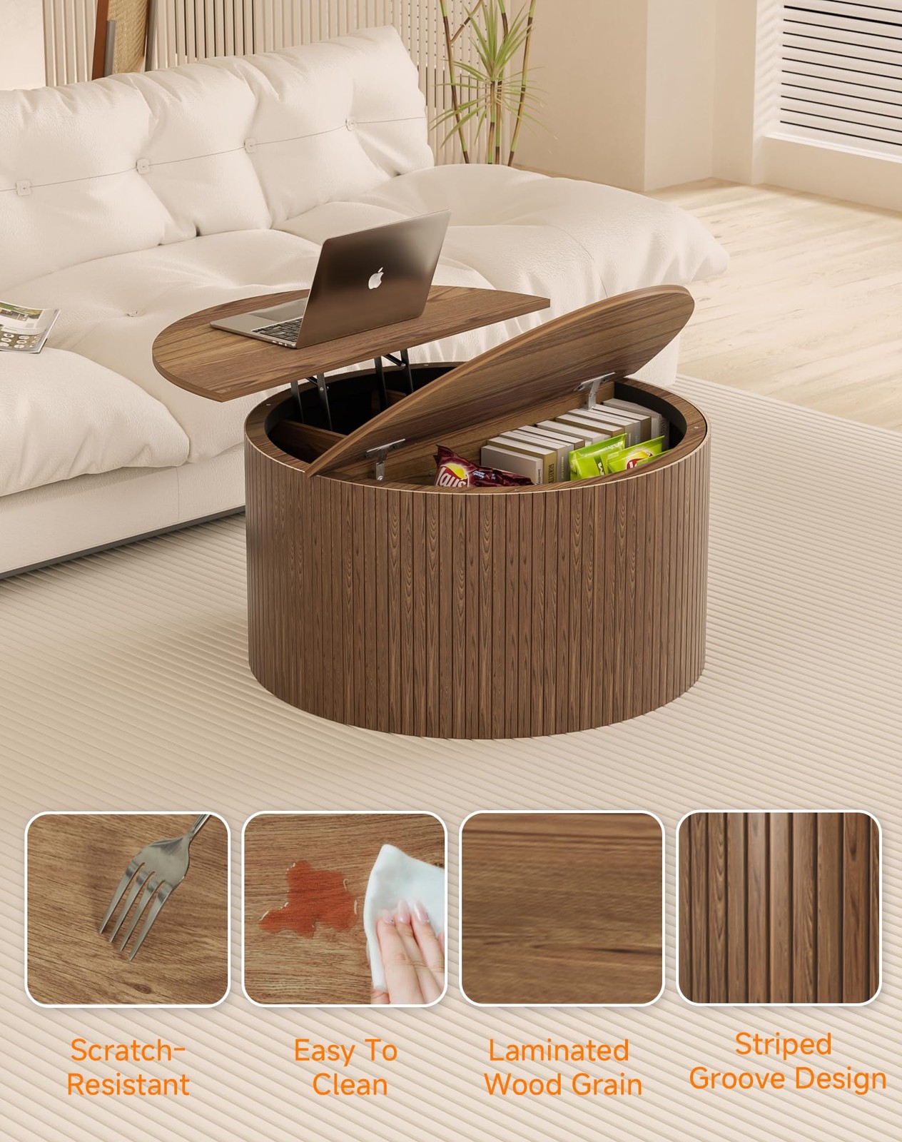 Fluted Round Lift Top Coffee Table with Storage, 31.5" Walnut Small Circle Wood Center Table for Living Room. 3、DURABLE AND STABLE: Small circle coffee table constructed from high-quality MDF with a water-resistant surface for easy maintenance; Rounded tabletop reduces collision risk.